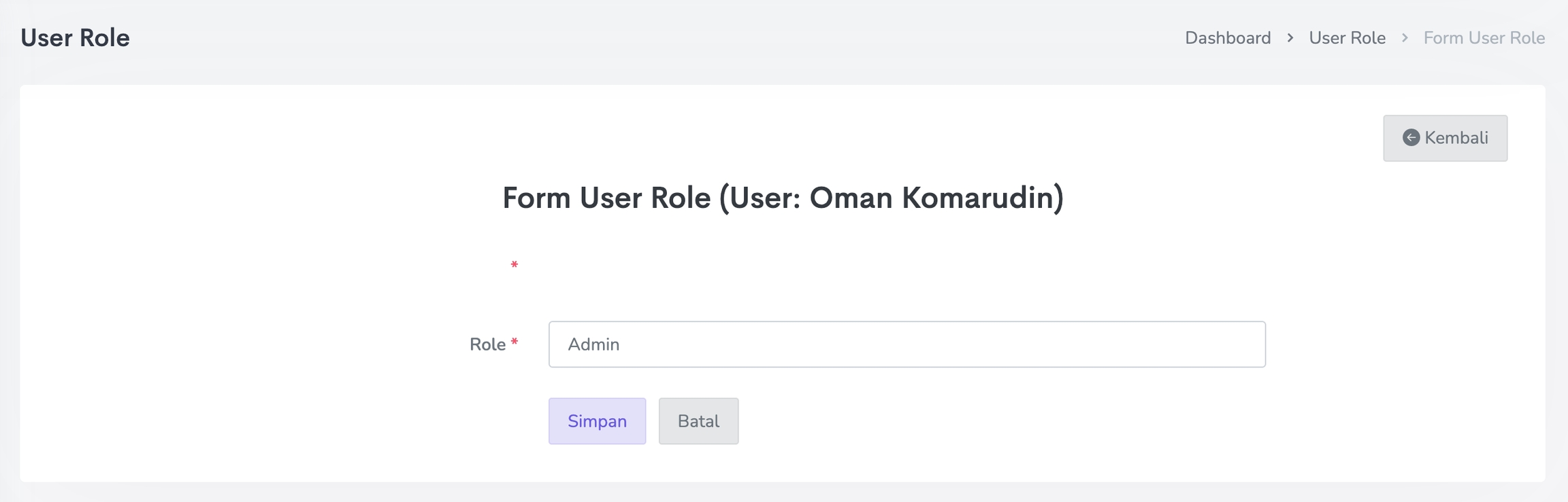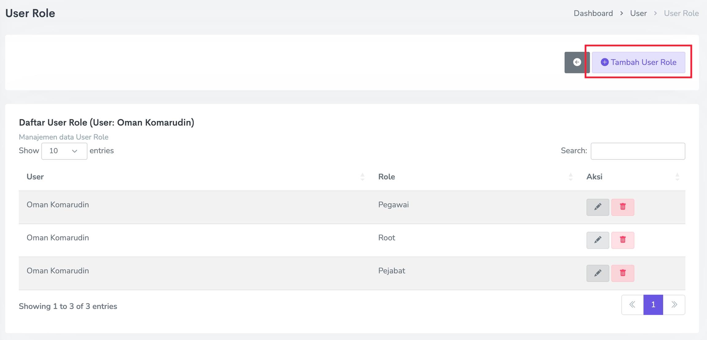 Klik tombol Tambah User Role untuk menambahkan peran/role pada pengguna tersebut