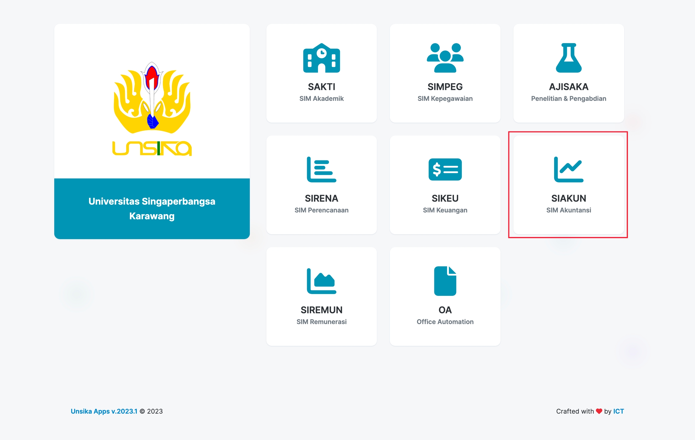 SIAKUN merupakan SI yang menerapkan sistem tertutup, artinya hanya pengguna yang memiliki akses saja yang dapat menggunakan SI ini. Untuk mengakses SI ini dapat melalui laman portal utama di alamat ... kemudian klik pada menu SIAKUN seperti pada gambar berikut: