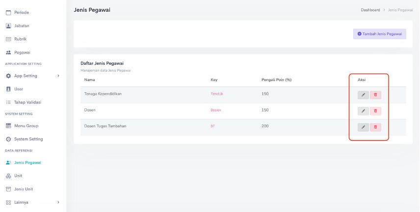 Untuk mengubah data referensi Jenis Pegawai, dapat dilakukan dengam menekan tombol edit (ikon pensil), dan untuk menghapus data Jenis Pegawai yang sudah ada, bisa menekan tombol hapus (ikon trash) pada tabel data Jenis Pegawai di kolom Aksi, seperti yang ditunjukkan pada gambar berikut: