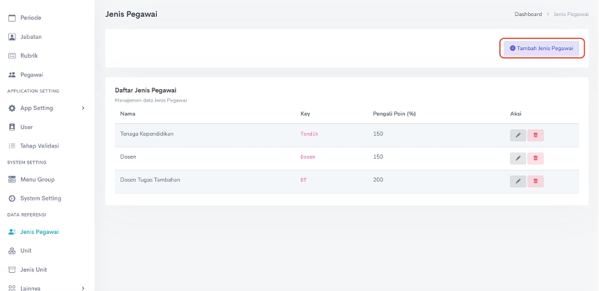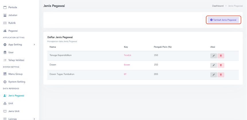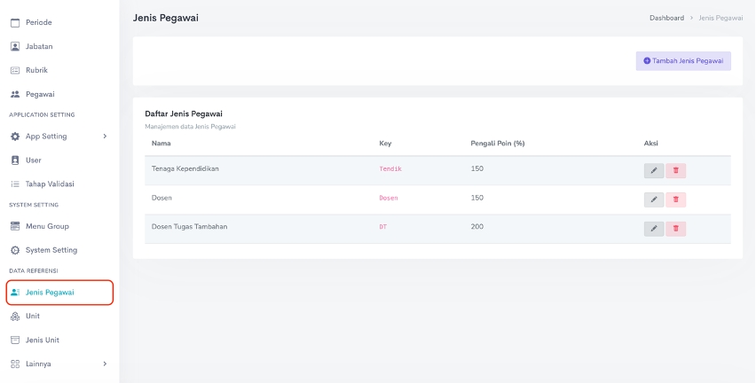 Data referensi jenis pegawai digunakan untuk mengatur klasifikasi pegawai untuk pembeda perhitungan remun yang berlaku, misalnya dalam suatu kegiatan atau aktivitas, perolehan poin untuk Dosen dengan tugas tambahan lebih besar nilainya dibandingkan dengan Dosen tanpa tugas tambahan. Tidak hanya itu, menu ini juga dapat digunakan sebagai pembatas maksimum poin yang dapat diperoleh untuk setiap jenis pegawai.