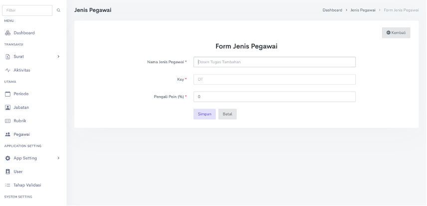 Isikan form Jenis Pegawai pada halaman Form Jenis Pegawai untuk menambah data Jenis Pegawai baru. Ketika sudah selesai mengisi semua form, klik tombol Simpan untuk proses menyimpan data.