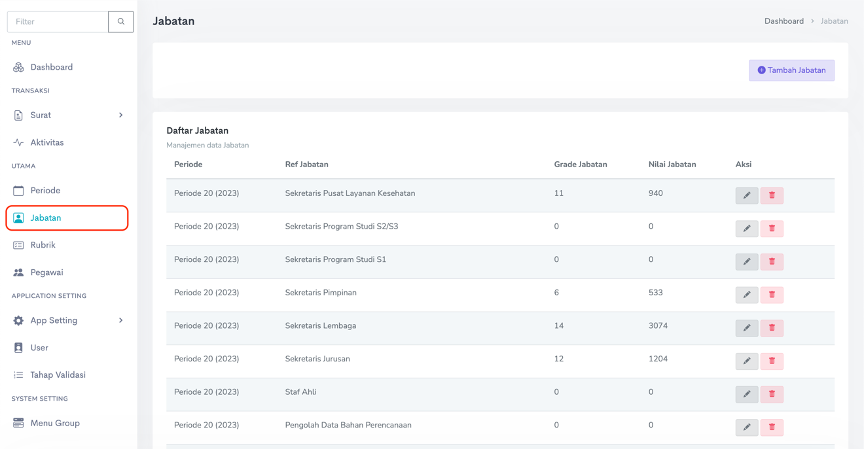 Tampilan pada menu Jabatan dapat dilihat pada gambar di bawah ini: