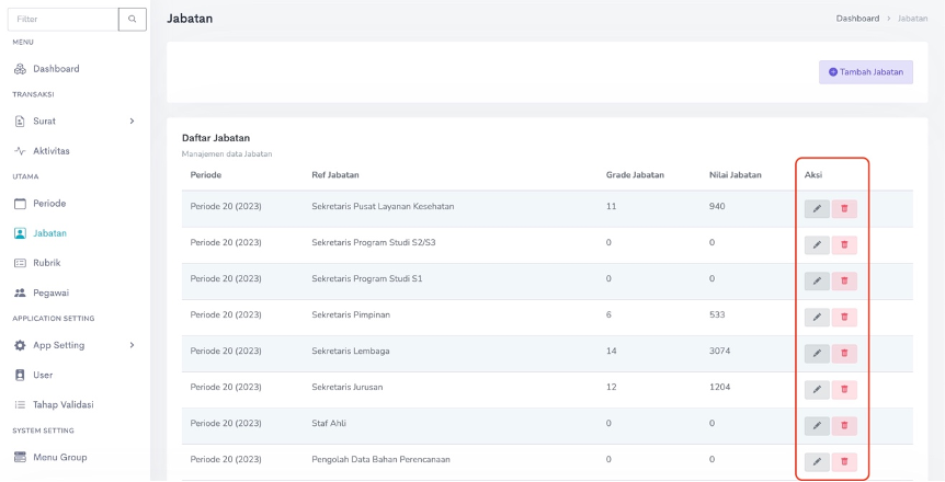 Untuk mengubah data Jabatan remunerasi, dapat dilakukan dengam menekan tombol edit (ikon pensil), dan untuk menghapus data yang sudah ada, bisa menekan tombol hapus (ikon trash) pada tabel data Jabatan pada kolom Aksi, seperti yang ditunjukkan pada gambar berikut: