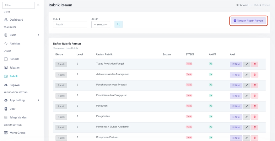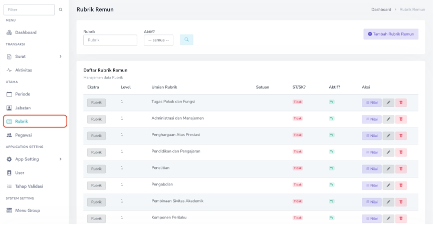 Data Rubrik digunakan untuk mengelola data Rubrik remunerasi, beserta nilai aktivitas (poin) yang akan didapat ketika seorang pegawai mendapat pekerjaan terkait dengan rubrik tersebut. Data Rubrik ini menggunakan basis periode, sehingga apabila terdapat perubahan data pada periode tertentu, tidak akan mengubah data Rubrik pada periode lain.
