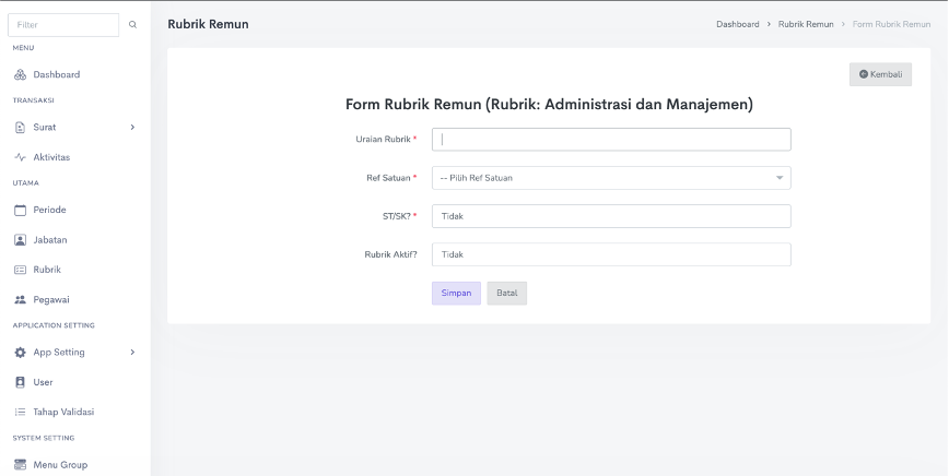 Isikan form pada halaman Form Rubrik Remun untuk menambah data baru. Ketika sudah selesai mengisi semua form, klik tombol Simpan untuk proses menyimpan data.
